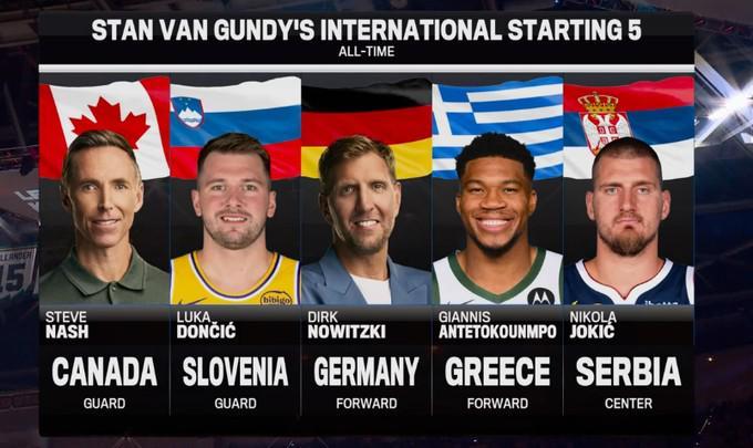 近日,前NBA主帅斯坦-范甘迪评选出了他心目中的国际球员最佳五人组。
